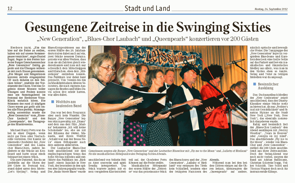 Unser Erwachsenenchor hat sein Motto-Konzert am vergangenen Samstag erfolgreich über die Bühne gebracht. Gemeinsam mit dem Blues-Chor Laubach, der aus Freunden des Vereins zusammengesetzten Live-Band sowie der vereinseigenen Tanzgruppe Queenpearls gestalteten die Aktiven von New Generation einen abwechslungsreichen Abend, der beim Publikum bestens ankam. Entsprechend positiv fiel die Berichterstattung in der heimischen Presse aus, worüber wir uns sehr freuen.