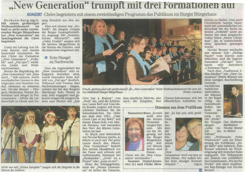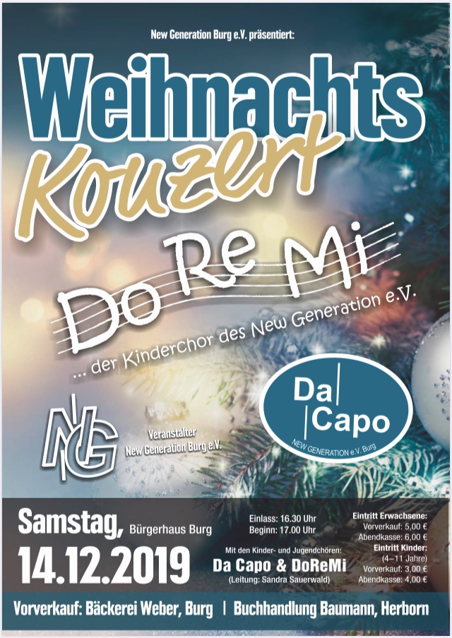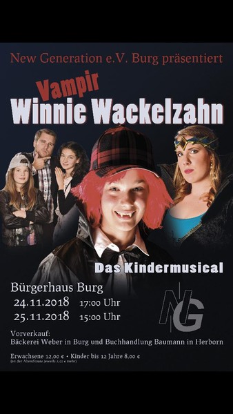 Die Nachwuchschöre des Vereins New Generation e.V. Burg führen am 24. und 25. November 2018 das Kindermusical Vampir Winnie Wackelzahn im Bürgerhaus in Burg auf. DoReMi und Da Capo zeigen in ihrem mittlerweile schon zweitem eigenen Musical, dass auch schon in den kleinsten Sängerinnen und Sänger wahrhaftig große Talente schlummern.
